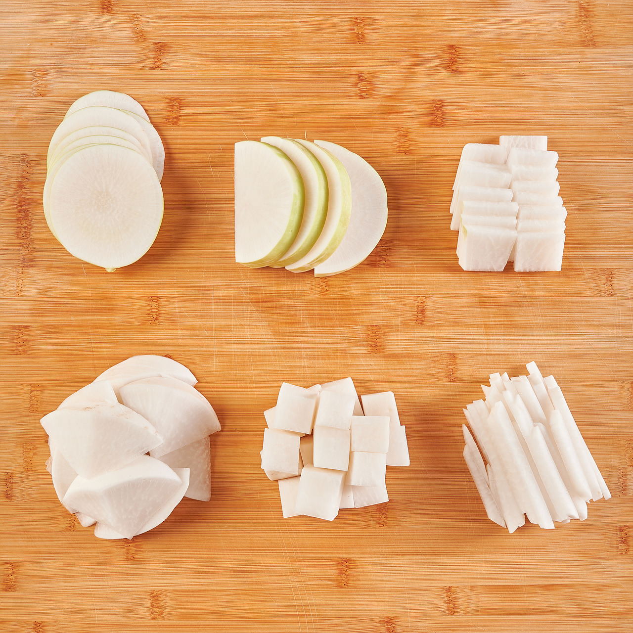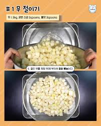 - 무는 껍질을 얇게 벗기고 2~3cm 크기로 썰기