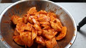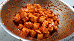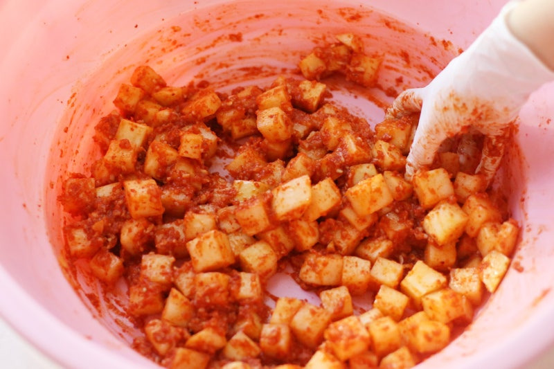 살살 버무리는 것이 깍두기 맛있게 담는법의 기술입니다.