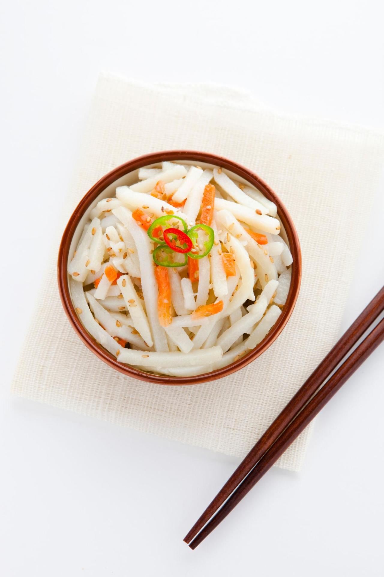 - 무를 가늘게 채 썰어주세요.