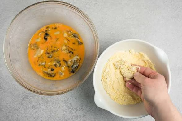 - 밀가루 묻힌 굴을 계란물에 담그기